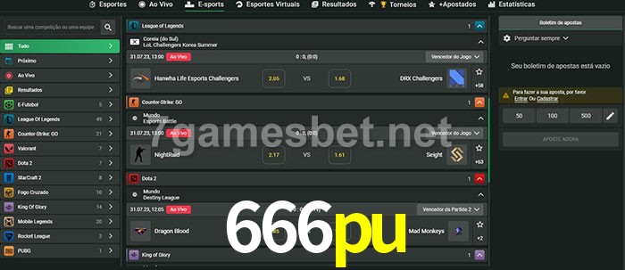 O 666pu oferece uma grande seleção de opções de apostas em e-sports com probabilidades competitivas